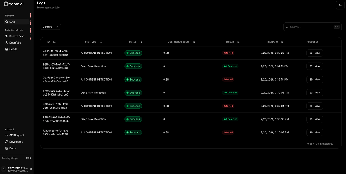 As the Lead Product Designer at Scam.ai, I worked closely with the team to design everything from our landing page to the main dashboards. My focus was on making our advanced AI models—like Deepfake and AI detection—easy to use and intuitive for both security analysts and developers.